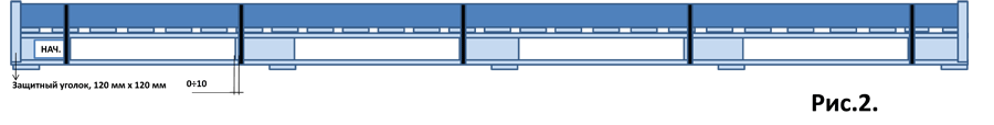 Панели крепится к поддону ПЭТ лентами шириной 19-20 мм поперек проката по каждому опорному бруску (рис.2). Лента должна быть закреплена не далее 1 см от края бруска. Затянутая лента не должна деформировать края панелей. Количество лент на поддон должно быть равно количеству опорных брусков, за исключением брусков, межосевое расстояние которых менее 950 мм. Дополнительно при отгрузке стопа панелей на поддоне фиксируется деревянными защитными уголками и ПЭТ лентами вдоль проката по каждому опорному бруску.