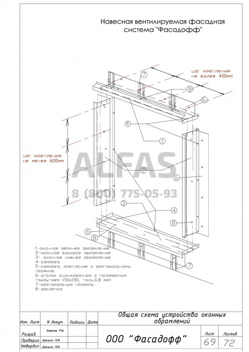 Элементы навесной вентилируемой системы: - паронитовая прокладка; - кронштейн; - горизонтальный профиль; - вертикальный профиль; Дополнительные элементы: - стальные профили для обрамления оконных и дверных проемов; - подоконники, оконные сливы; - крепежные элементы (анкера, саморезы, заклепки)